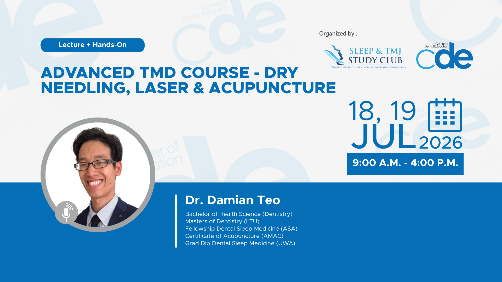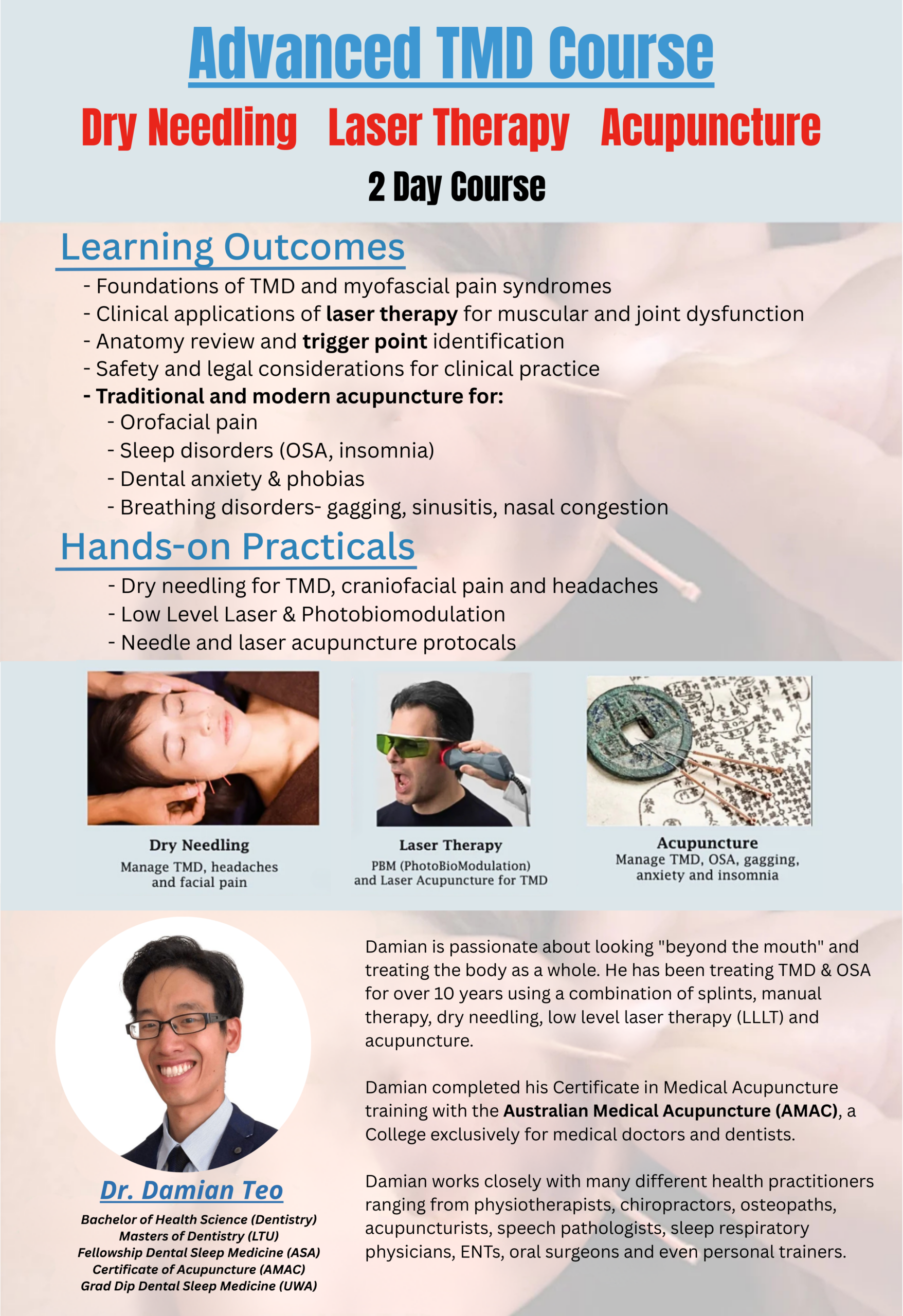 Join us for a comprehensive 2-day course tailored for dental and allied health professionals who wish to broaden their clinical skills in the management of Temporomandibular Disorders (TMD) using evidence-based adjunctive techniques: dry needling, low-level laser therapy (LLLT), and acupuncture.